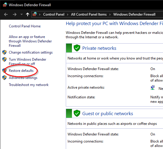 💡 If nothing works, reset your firewall to default settings (in Windows Defender Firewall):
